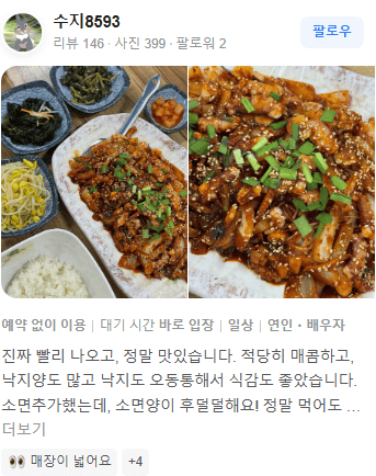 "낙지도 완전 통통하고 매콤하고 넘 맛있어요."