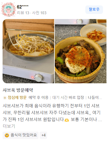 네이버 리뷰보다 카카오맵 리뷰가 더 신뢰가 가신다면, 아래에서 소고기 샤부샤부 초저가 샤브옥의 카카오맵 리뷰를 더 보실 수 있습니다.