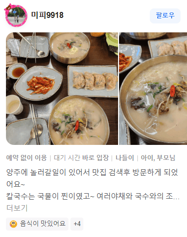 "칼국수는 국물이 찐이였고, 만두도 직접 만드는 손만두로 칼칼하니 맛있었습니다."
