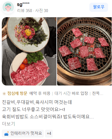 "고기 가성비 있고 점심에 오기도 좋은 것 같아요."