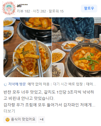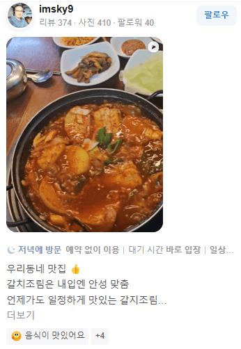 네이버 리뷰보다 카카오맵 리뷰가 더 신뢰가 가신다면, 아래에서 생방송 투데이 갈치조림 수복식당 검단점의 카카오맵 리뷰를 더 보실 수 있습니다.