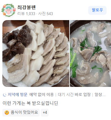 네이버 리뷰보다 카카오맵 리뷰가 더 신뢰가 가신다면, 아래에서 생생정보 5,500원 돼지국밥 대명돼지국의 카카오맵 리뷰를 더 보실 수 있습니다.