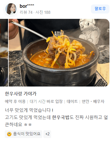 "매장 넓고 친절하시고 무엇보다 오랜만에 제대로 한우국밥을 먹었네."