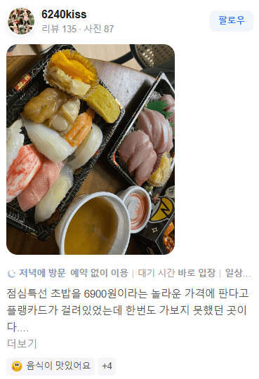 네이버 리뷰보다 카카오맵 리뷰가 더 신뢰가 가신다면, 아래에서 초밥나라의 카카오맵 리뷰를 더 보실 수 있습니다.