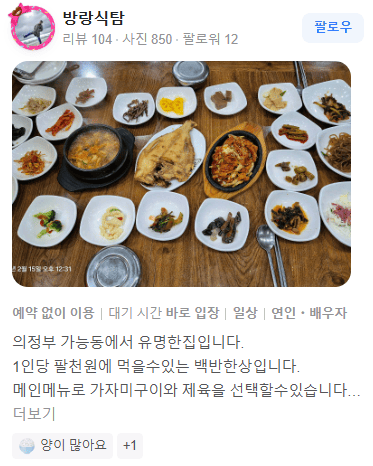 "의정부 가능동에서 유명한집입니다. 1인당 팔천 원에 먹을 수 있는 백반한상입니다."