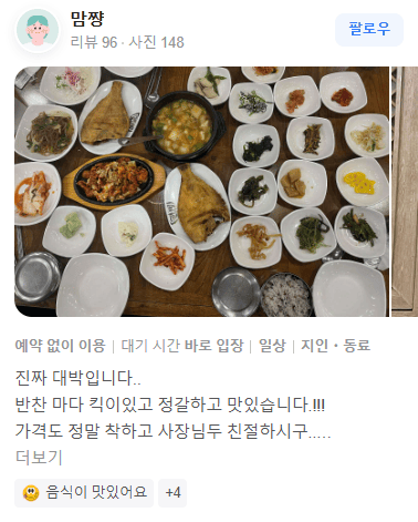 "진짜 대박입니다. 반찬마다 킥이 있고 정갈하고 맛있습니다."