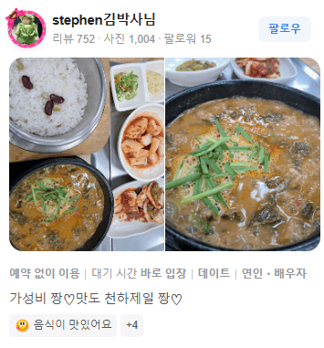 네이버 리뷰보다 카카오맵 리뷰가 더 신뢰가 가신다면, 아래에서 생생정보 가격파괴 why 추어탕 천하제일용천추어탕의 카카오맵 리뷰를 더 보실 수 있습니다.