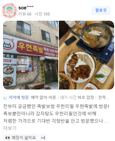 네이버 리뷰보다 카카오맵 리뷰가 더 신뢰가 가신다면, 아래에서 인천 우현족발의 카카오맵 리뷰를 더 보실 수 있습니다.