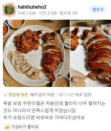 "무한리필에 족발 퀄리티 실화입니까? 정말 야들야들 쫄깃쫄깃 너무 잘 먹었어요."