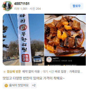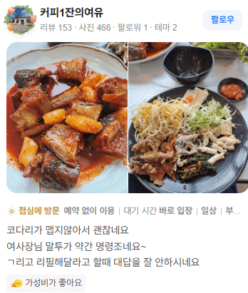 "코다리 맛있고 다양한 반찬이 있고 가격도 착해요."