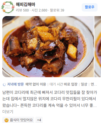 네이버 리뷰보다 카카오맵 리뷰가 더 신뢰가 가신다면, 아래에서 코다리무한리필의 카카오맵 리뷰를 더 보실 수 있습니다.
