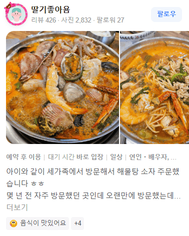 "얼큰한 해물탕과 해물찜이 매력적인 곳이에요."