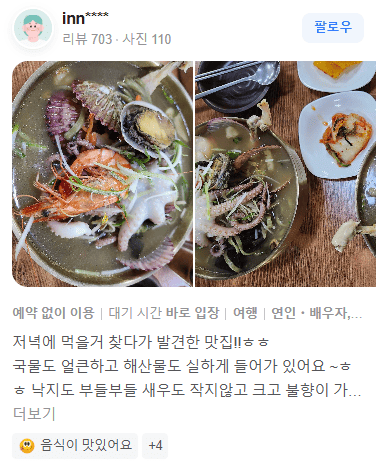 네이버 리뷰보다 카카오맵 리뷰가 더 신뢰가 가신다면, 아래에서 대왕암 돌미역 칼국의 카카오맵 리뷰를 더 보실 수 있습니다.