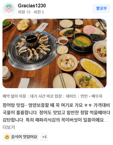 "장어탕 맛집~ 영양보충할 때 꼭 여기로 가요. 가격대비 국물이 훌륭합니다."