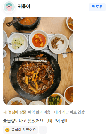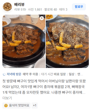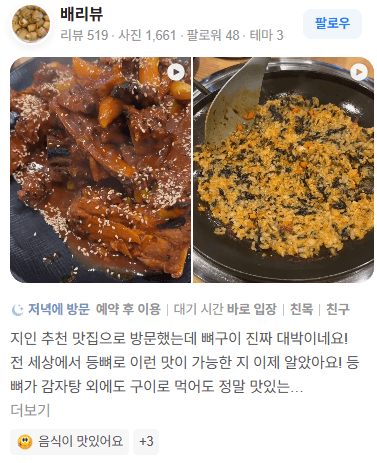 "지인 추천 맛집으로 방문했는데 뼈구이 진짜 대박이네요!"
