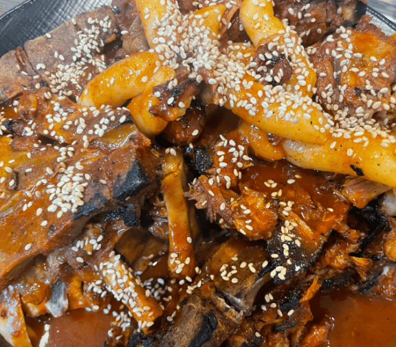 이곳의 가장 인기 있는 메뉴 중 하나는 매콤 뼈구이로, 국산 등뼈를 사용하고 매콤한 양념과 불맛을 더해 한 입 먹어보면 숯불향 가득한 매콤한 바베큐 맛이 큰 특징입니다.