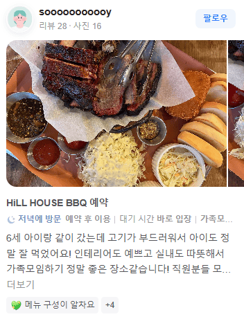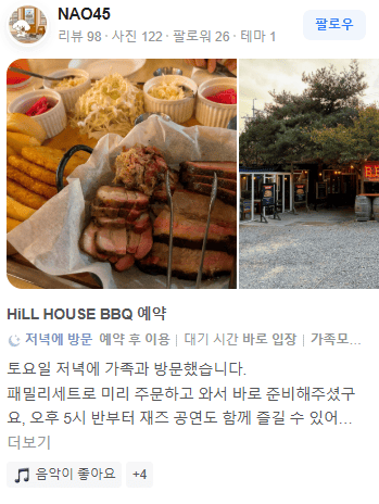네이버 리뷰보다 카카오맵 리뷰가 더 신뢰가 가신다면, 아래에서 텍사스식 바비큐 힐하우스 커피 바베큐의 카카오맵 리뷰를 더 보실 수 있습니다.