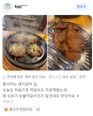 네이버 리뷰보다 카카오맵 리뷰가 더 신뢰가 가신다면, 아래에서 생생정보 장사의 신 27년 전통 숯불 돼지갈비 담양숯불떡갈의 카카오맵 리뷰를 더 보실 수 있습니다.