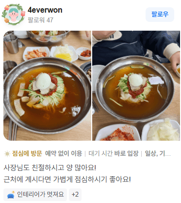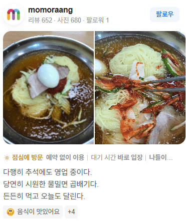 네이버 리뷰보다 카카오맵 리뷰가 더 신뢰가 가신다면, 아래에서 28년 내공 행주여행밀면의 카카오맵 리뷰를 더 보실 수 있습니다.