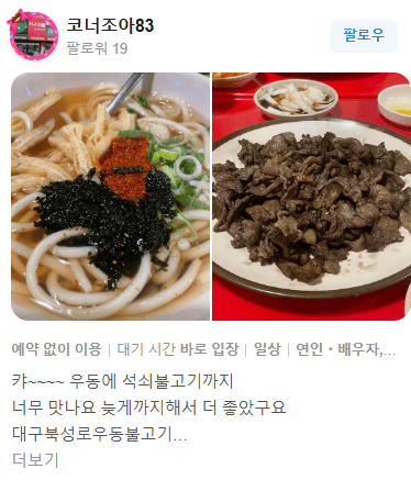 "역시 대구 북성로 석쇠우동불고기는 태능집입니다. 최고."