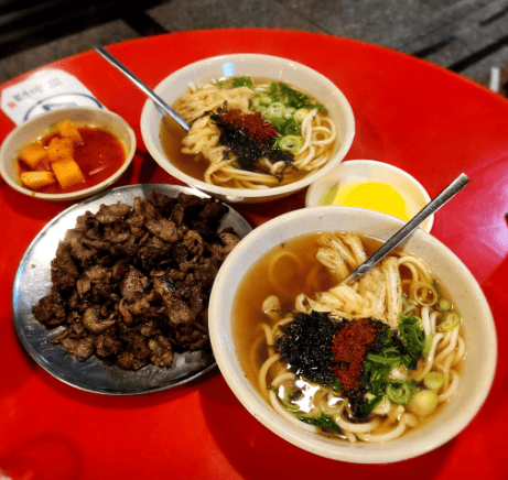 이곳의 대표 메뉴 중 하나는 우동(가락국수)로, 4,000원의 저렴한 가격에 주문 즉시 육수에 우동면을 삶아내고 뜨끈한 국물을 붓고, 유부, 파, 김가루, 고춧가루를 뿌려 금방 나오며 깔끔하고 시원한 국물이 일품입니다.