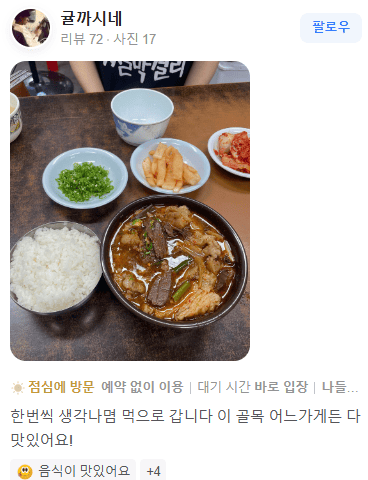 네이버 리뷰보다 카카오맵 리뷰가 더 신뢰가 가신다면, 아래에서 십이리할매소구레국밥의 카카오맵 리뷰를 더 보실 수 있습니다.
