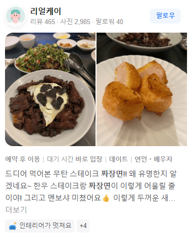 "한우 스테이크랑 짜장면이 이렇게 어울릴 줄이야! 그리고 멘보샤 미쳤어요."