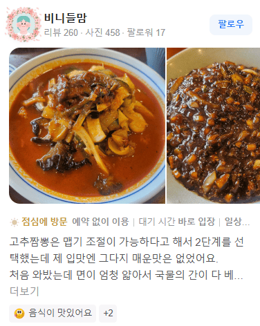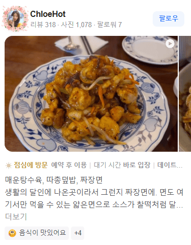 네이버 리뷰보다 카카오맵 리뷰가 더 신뢰가 가신다면, 아래에서 따총밥 맛집 린 중화요의 카카오맵 리뷰를 더 보실 수 있습니다.