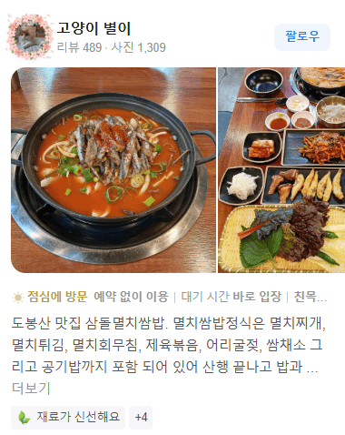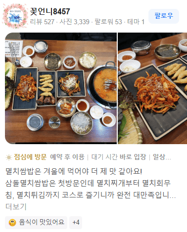 네이버 리뷰보다 카카오맵 리뷰가 더 신뢰가 가신다면, 아래에서 도봉산 삼돌멸치쌈밥의 카카오맵 리뷰를 더 보실 수 있습니다.