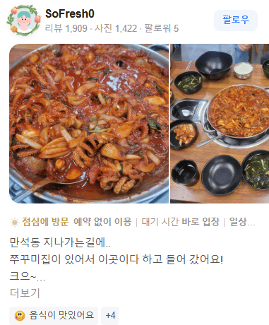 "쭈꾸미 볶음 너무 맛있고 사장님은 정말 친절하세요."